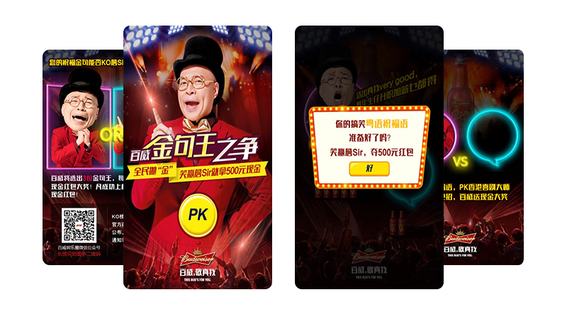 亮点:百威啤酒为契合新年节日的H5互动,获取用户头像,模拟与香港喜剧大师詹瑞文pkt金句的真实场景,引导用户写下搞笑金句,最终评选出3位金句王送出百元新年红包,刺激用户参与与分享。