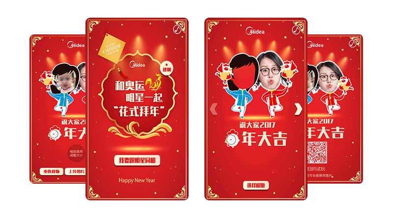 亮点:借与体育明星同框拜年这个自带流量的热点,吸引用户选择自己钟爱的与体育明星同框合照的模板,上传自己的头像照片后即可自动生成专属的拜年动图。很讨喜的Q版明星大头贴,加上生动活泼的动态拜年姿势,使得该H5受到年轻人群的热捧,所生成的动态图带有美的品牌logo及该H5的二维码入口,极大地刺激了用户进行二次传播,使得品牌传播更加广泛。