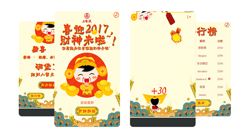 亮点:五粮液接财神微信互动游戏,滑动屏幕,控制五掌柜左右移动方向。接住财神爷撒下的元旦和五粮液礼盒,避开鞭炮,在规定时间内完成游戏就可参与排名领取奖励,最后显示成绩。
