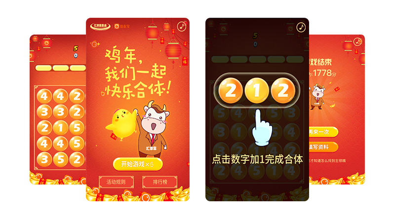 亮点:一款简单又好玩的数字合成益智类游戏,一旦开始就停不下来!红色设计界面,呈现出过年气氛。游戏一共五次机会,将数字加一完成合体,三个数字完全一样的球体则自动次合成,达到更高的分数,这款H5案例非常具有可玩性。