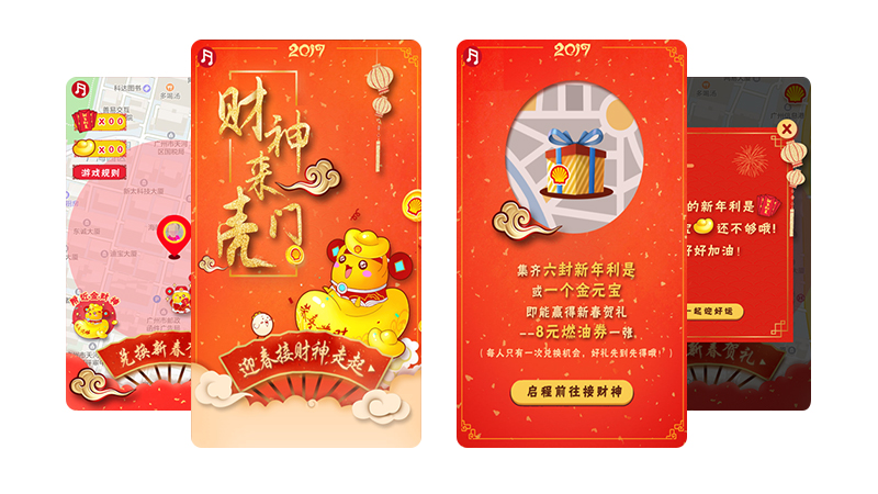 亮点:别开生面的LBS交互玩法颇具新意,获取用户当前的位置信息后,通过点击指定区域内的财神标志即可获得红包,另外在壳牌合作加油站的区域会呈现金元宝,集齐一定数量的金元宝可兑换油卡,通过集元宝结合LBS定位的玩法引导用户去各大加油站,为线下加油站导流。