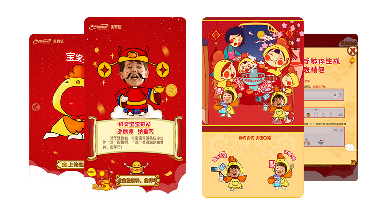 亮点:上传宝宝萌照生成新年动态搞笑表情,多种表情模板选择,产品自然融入模板中,上传完成可以生成专属表情包,用户在分享的同时宣传产品。