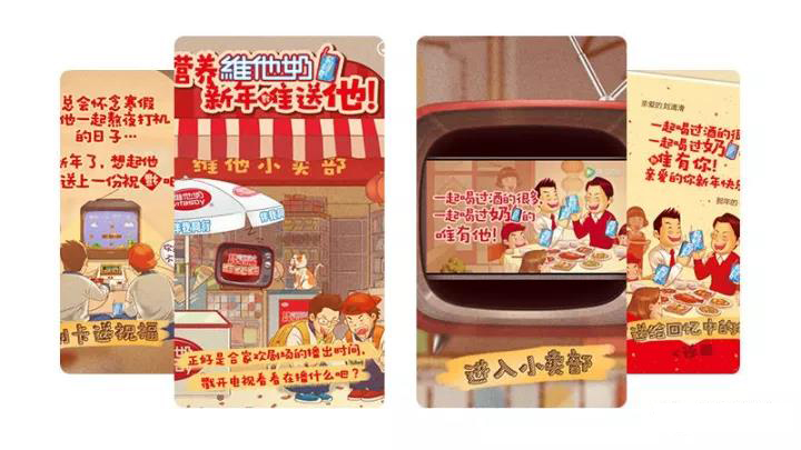 亮点:维他奶怀旧风格微场景,怀念亲情、爱情、友情等,向怀念的人赠送贺卡,分享之后可以获得红包,导流天猫京东,创新传播红包玩法,2天超20万分享,高转化高关注。