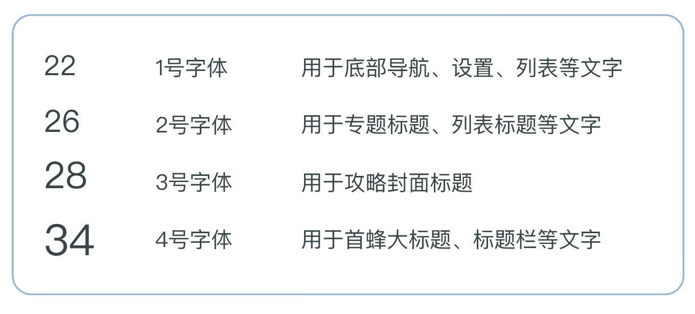 将文字的使用列成使用表之后,可以从字体的不同的使用方面分析出文字层级的设置方向、该如何系统的管理字体在产品中的运用。这些思考不仅可以更好的规范自己即将要设计的产品,从开发的角度来将还可以更好的协同工作开发。