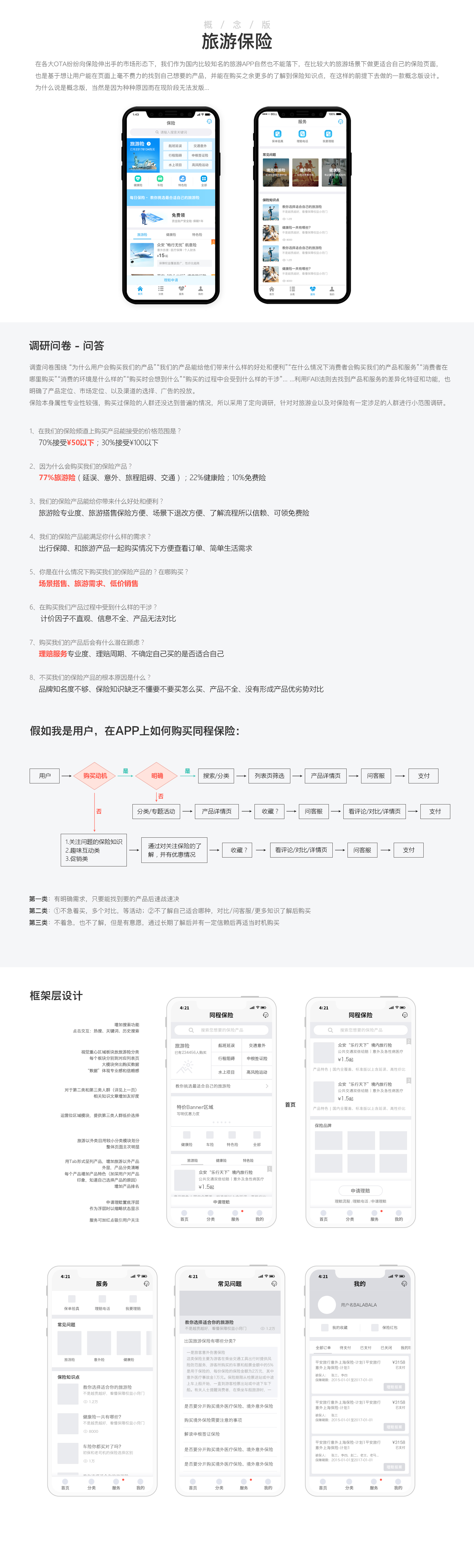 基于想让用户能在页面上毫不费力的找到自己想要的保险产品的前提下去做的一款旅游平台下的保险APP概念版设计