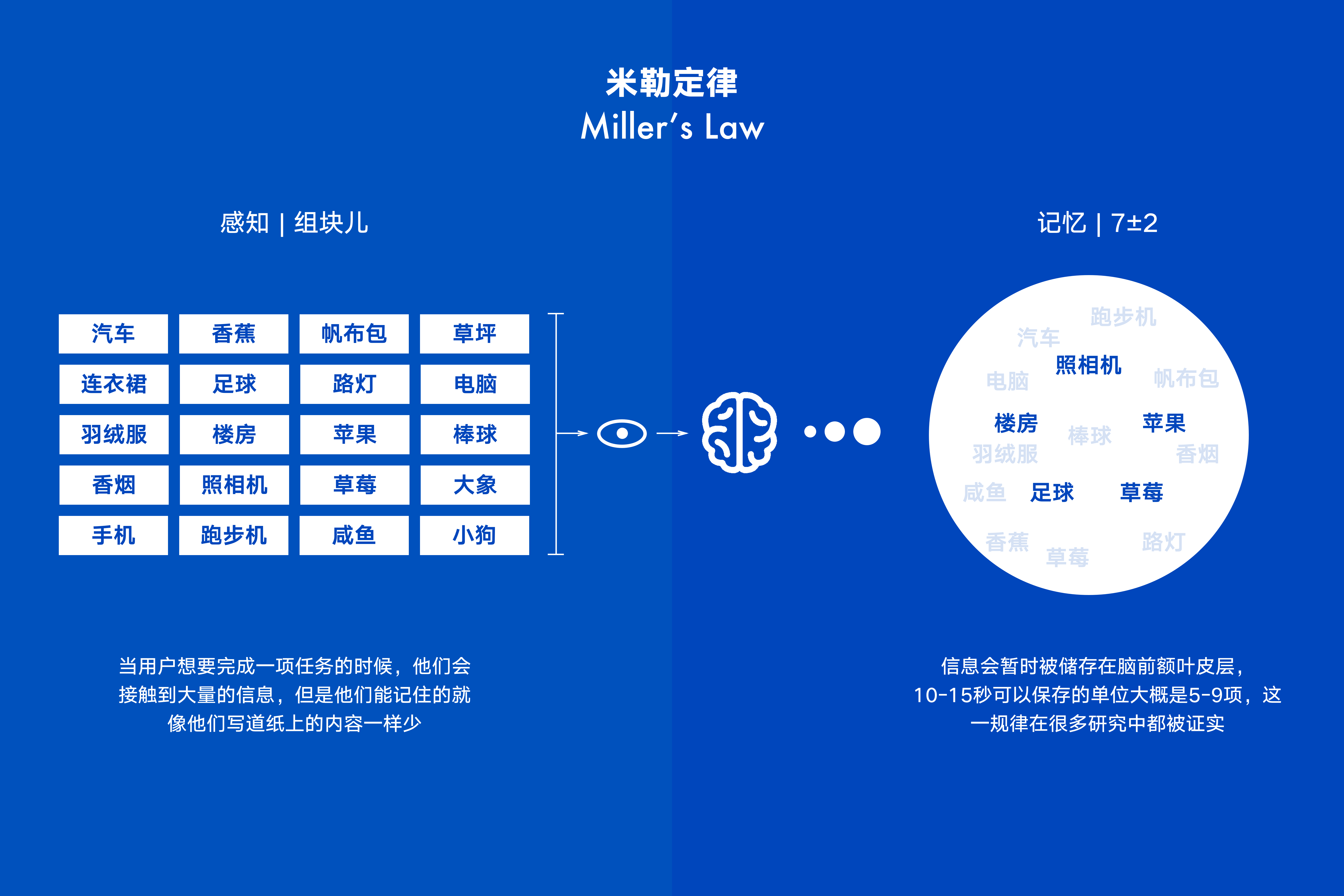 我相信,除了少数的人,你会像大部分人一样,只会记得5-9个名词。数百个实验已经证明了这种记忆的极限的普遍性。当我第一次在《交互设计精髓》中看到这一定律时,就明白它对于产品设计有不可忽视的影响,因为这种自然限制在影响着我们的阅读效率和工作效率,短时间内记忆7个左右信息普遍规律被称为“米勒定律”