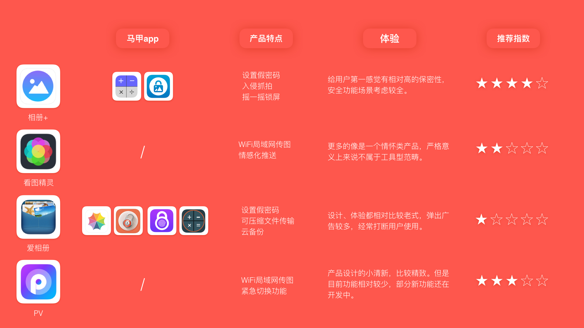 针对相册加密类app。最重要的就是站在上帝视角,考虑各个场景下的用户实际痛点。