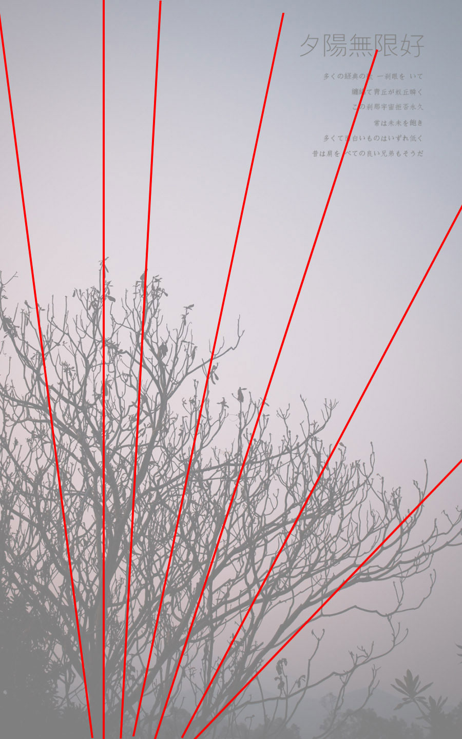 利用直线不规则分布的方式来构图,如果细心的同学应该发现了,最粗的那棵主角树是出现在黄金分割线上的,不要问我为什么这么屌哈。