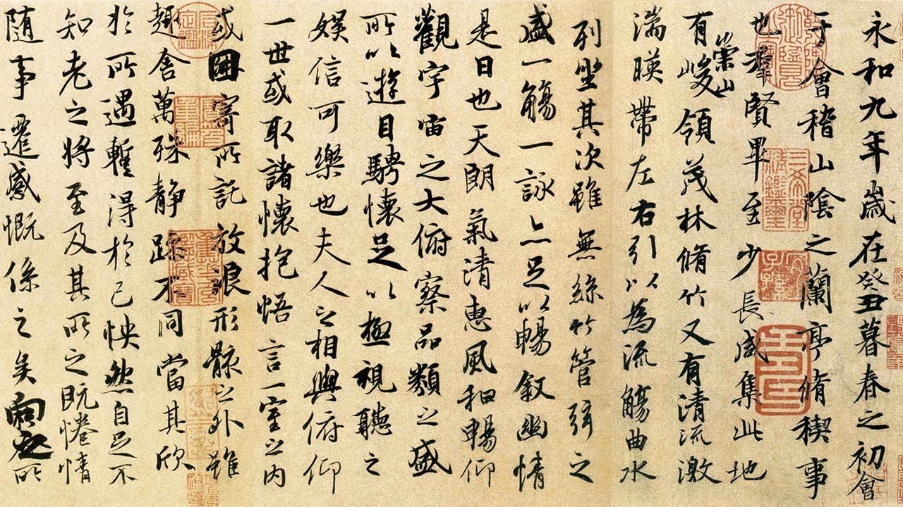 行书是介于楷书与草书之间的一种书体。它保留了楷书工整规范、清晰可认的长处,又兼备草书笔势连绵、快速书写的特点,可以说是实用性与艺术性相结合的书体。所以行书从产生到现在,一直盛行不衰。东晋的大书法家王羲之就是长于行书而名垂史册,他的《兰亭序》被称为天下第一行书。