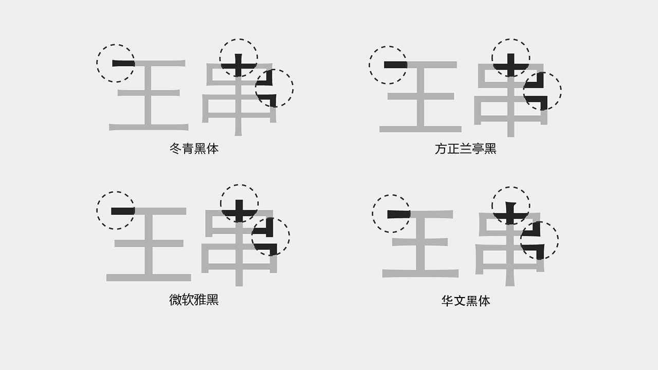 字体通常不是单字出现的,那么成段出现的文字就涉及到了字体灰度的统一性了,通过对字体笔画粗细的调整,来统一笔画过多而造成的,某一个字在文段中过于突出的问题,黑涂涂一团。