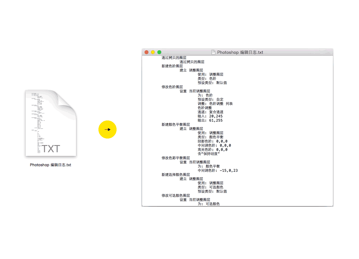 打开它,你会发现,你刚才在Ps中对那个图片做的任何,注意我说的是任何操作,Ps都将这些操作的详细操作步骤,甚至是相惜设置参数,都一个不差的保存到了这个文本中,它的作用就是帮助你保留好做图的珍贵数据,以便出现找不到处理后的文件时,你可以参照这个列表拿出原图直接按照操作来制作,其实这个也就类似系统日志,相当于是买了个保险,一旦出现问题,可以做到有理可依。