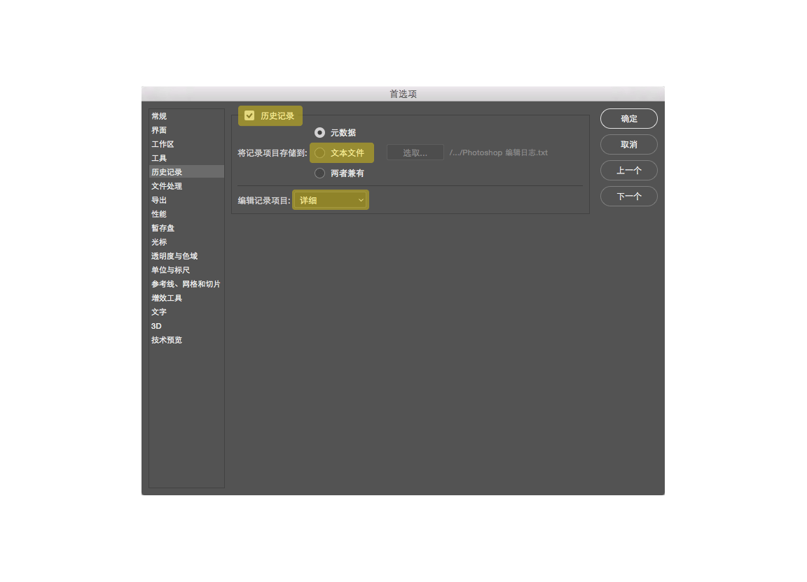 个问题呢,Ps也给你提供了一个很强大的助手,在哪呢,按“Ctrl+K”调出首选项,找到历史纪录,看到上图我刷上颜色的那里了么,勾选好“历史纪录”,然后把最下面那个“编辑纪录项目”选成“详细”,然后你就可以把中间那个将纪录存储到“文本文件”勾上了,随即系统就会给你弹出一个神秘的东西。