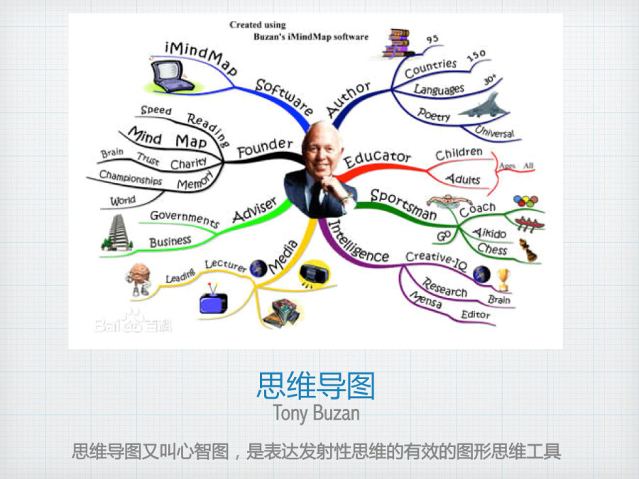 这样的一个记录的过程,叫做思维导图,也成为脑图/心智图,创始人是Tony Buzan。