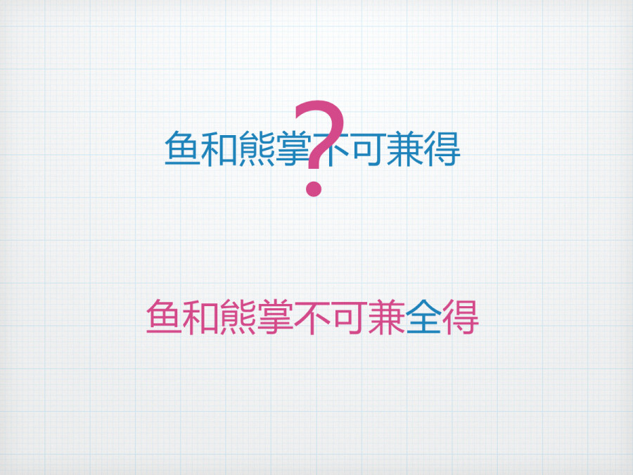 在这些点的选择中,也常常会遇到一个问题,什么都想要,但是却矛盾重重。面对这样的情况,首先,用刚才的思路,把那些需求都分解了,寻找共存的可能,而如果不能100%共存,那便是另一个问题,鱼和熊掌不可兼得否?