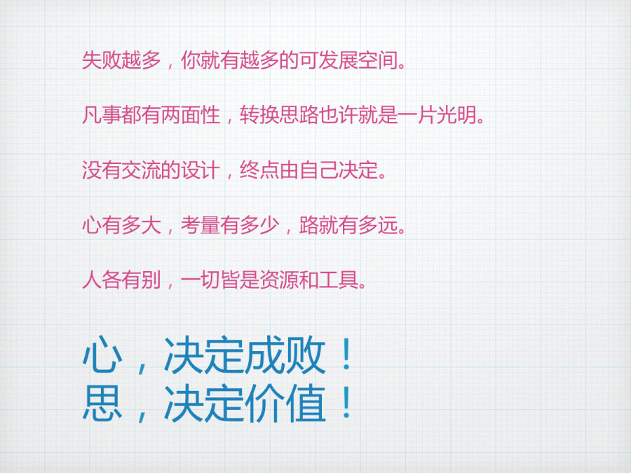 失败是成功之母,这句话在于你对失败的看法,失败除了告诉你有路走不通外,同样也告诉了你,你还有哪些方面有提高的空间,所以不要丧气,正面失败。