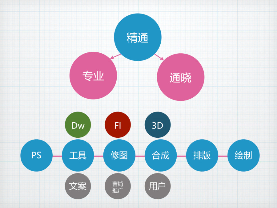 而我们要做好,我们必须得做得更精通!!首先是那些我们需要知道的一些规范,他们是我们首先要捕获的点;其次是能够把规范运用起来,做好我们的本职工作,知道做好一个完整的设计需要那些规范,需要怎样去链接,这是线;最后,就应该是让我们做得更精通,我们不是只会单纯的操作人员,不是统称的设计师,我们每个人都有不同的划分,有UI设计师,有平面设计师,有网页设计师……划分的标准就是我们精通的领域。
