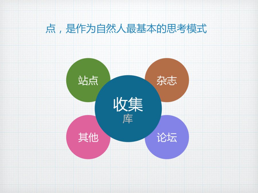 点,作为自然人最基本的思考模式,我们通常会从站点、杂志、论坛以及其他途径去获取我们想要了解的一切,这个过程是一个收集的过程,收集到的所有一切,形成了每个人自己的库,所谓胸中有墨,库有多丰富,你的所思所想,你的眼界,甚至你的前路,就会有多大的空间。