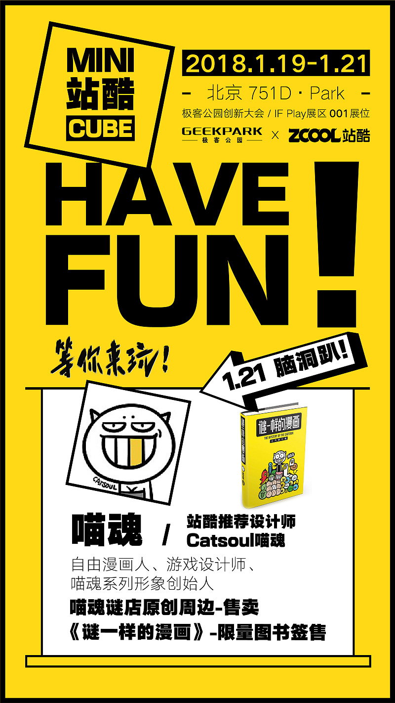 2018年1月21日,独立游戏设计师、自由漫画师、喵魂系列形象创始人Catsoul喵魂(站酷ID:Catsoul喵魂)在现场签售其新书《谜一样的漫画》,并带来了迷之微笑的喵魂大人周边产品。大学广告策划专业出身的Catsoul喵魂画漫画已有八、九年时间,她创作的喵魂系列形象生动有趣、脑洞巨大,并制作了风格独特的汉仪喵魂体字体。
