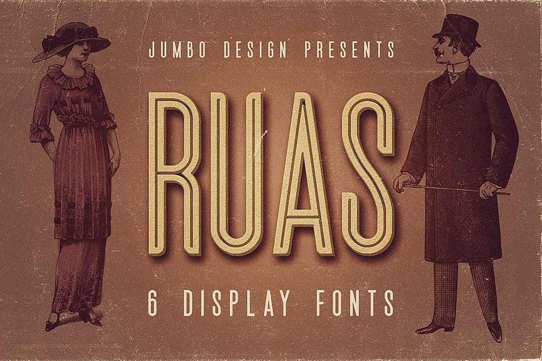 这是另一种时尚的字体,最适合与时尚有关的logo,甚至是饮料瓶标签的设计。Ruas的字体设计特点带有grunge风格的复古设计,并添加了纹理表面,字体有6种不同的样式可以供你选择。
