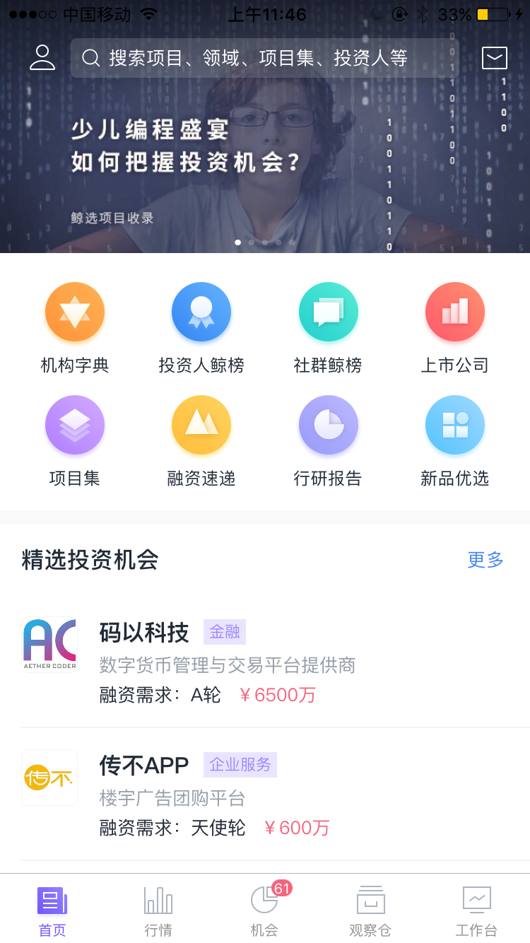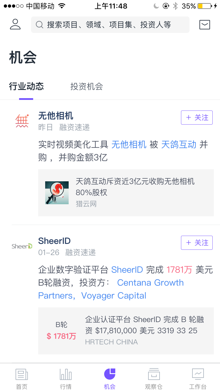 底部第三个菜单为机会。里面可以看到行业的融资动态,以及正在期望融资的项目。