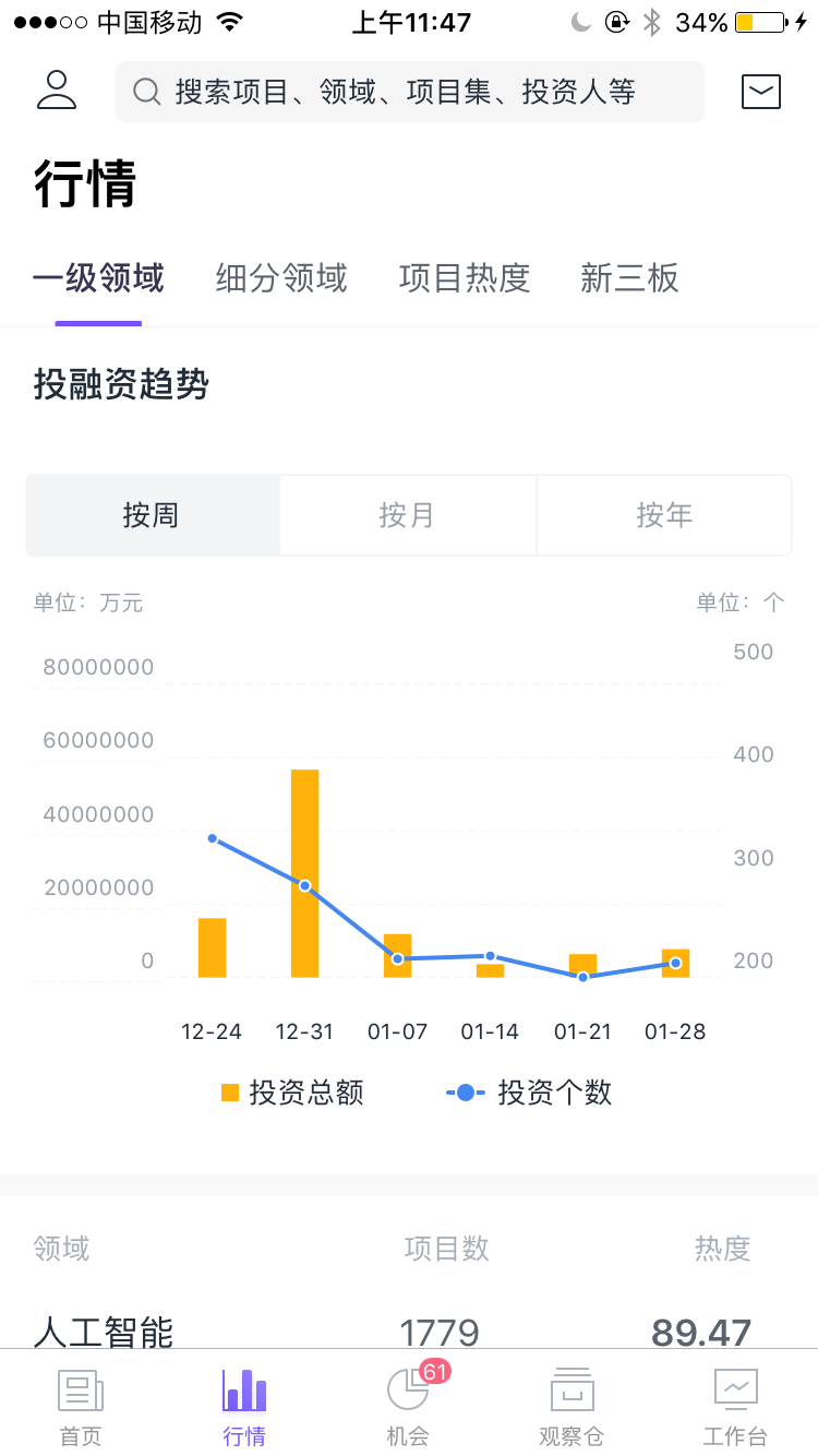 底部第二个菜单为行情,分为四类:一级领域、细分领域、项目热度、新三板。