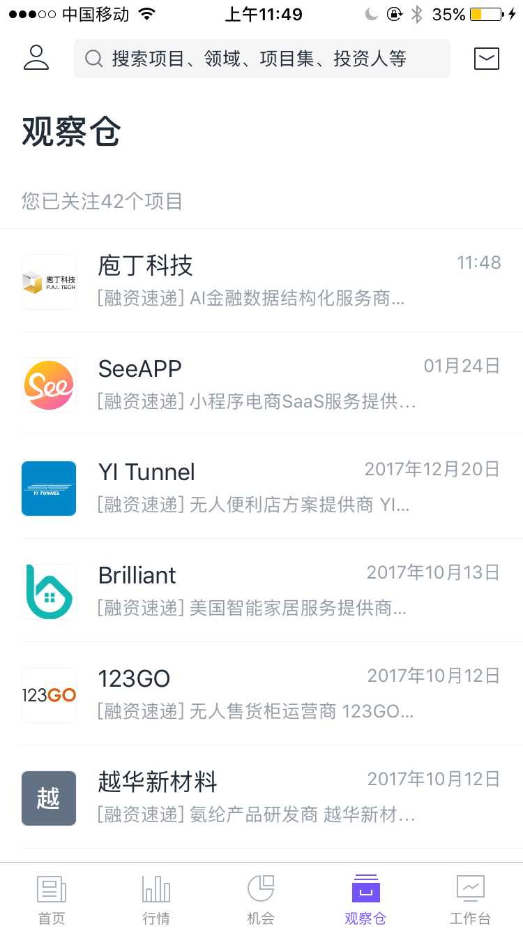 底部第四个菜单为观察仓。里面就是你添加了关注的项目。点一下可以看到每个项目的最新融资动态。