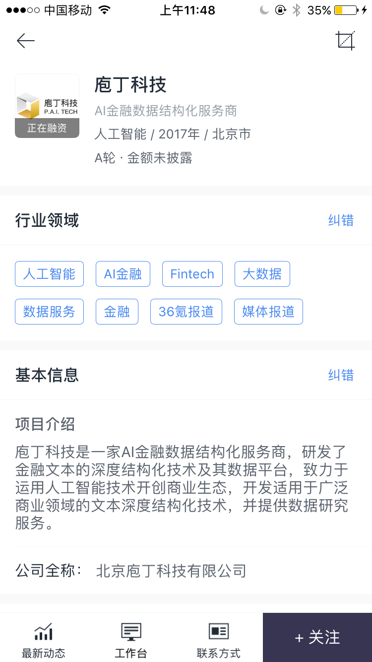 我们点开一个项目,可以看到它目前相关的信息及融资情况。例如庖丁科技,你可以看到它的行业领域、项目介绍、股权融资,以及相关竞品。