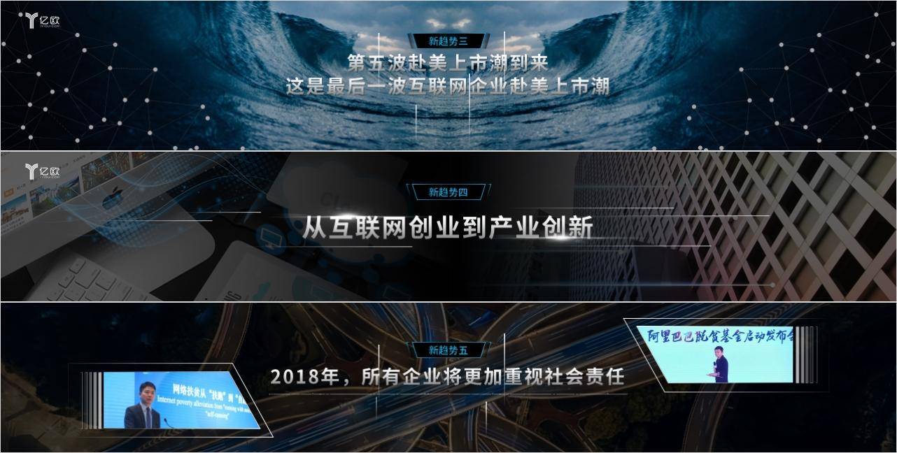 第二张想表达的意思是亿欧认为“服务实体经济将成为2018产业创新的核心主题,一直以来,亿欧专注于研究如何借助新科技、新理念和新政策来驱动实体经济的发展,并在过去的一年内办了很多次峰会。此处演讲者并没有要讲具体某一次峰会,而是想强调这一年亿欧为了探索未来实体经济的发展,办了12次峰会。所以我们采用了图片墙的方法,来烘托气势。