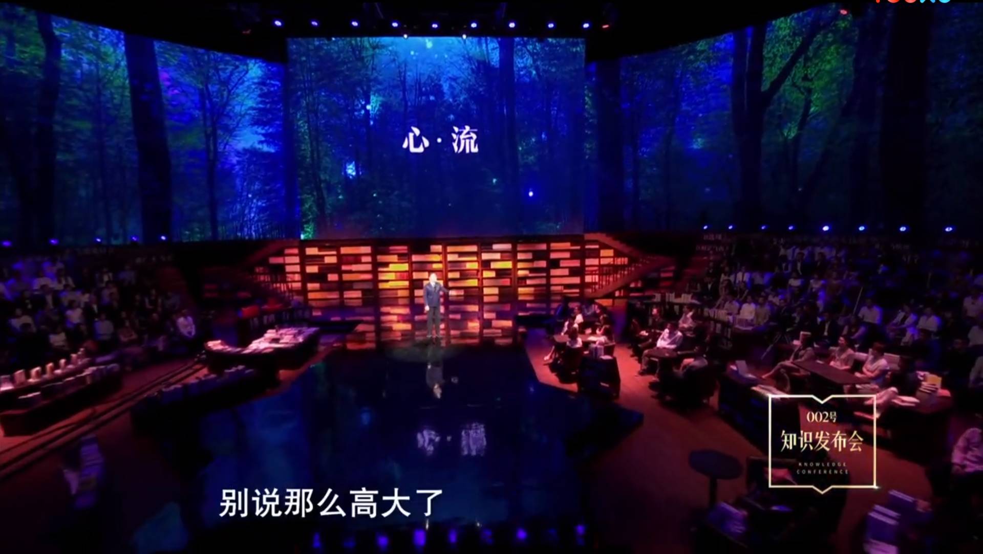 为了给现场听众创造“心流”体验,罗辑思维的002号知识发布会特意采用了环形屏的设计,然后现场所有人都置身于罗振宇创造的心流场景中,配合书架、钢琴伴奏、舞台灯光等因素,沉浸感非常强烈。