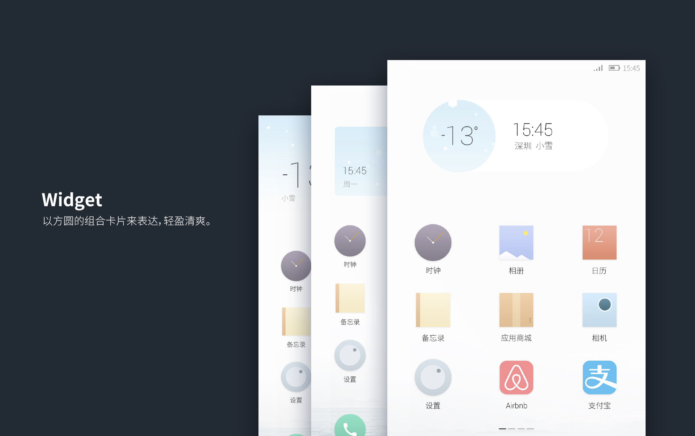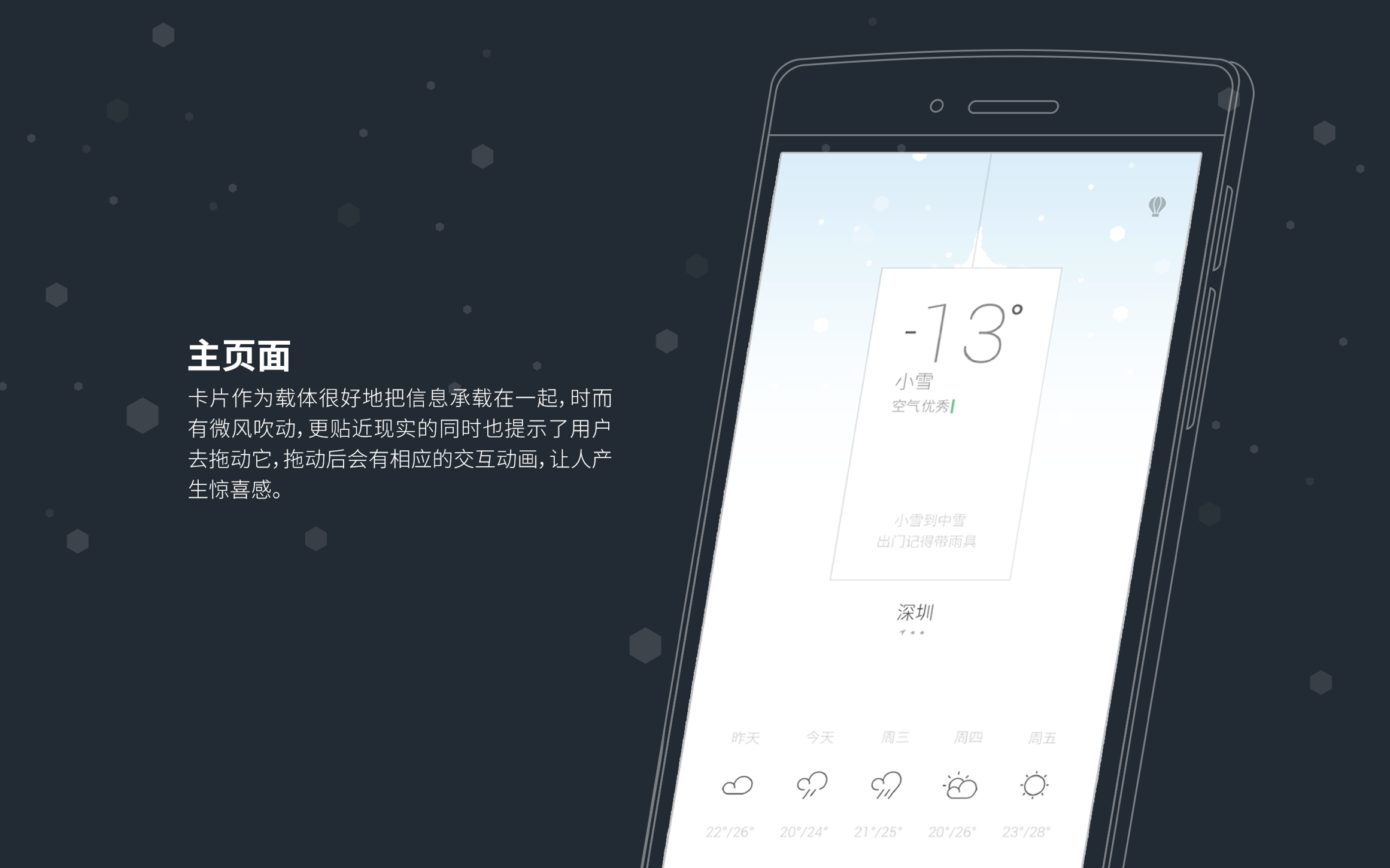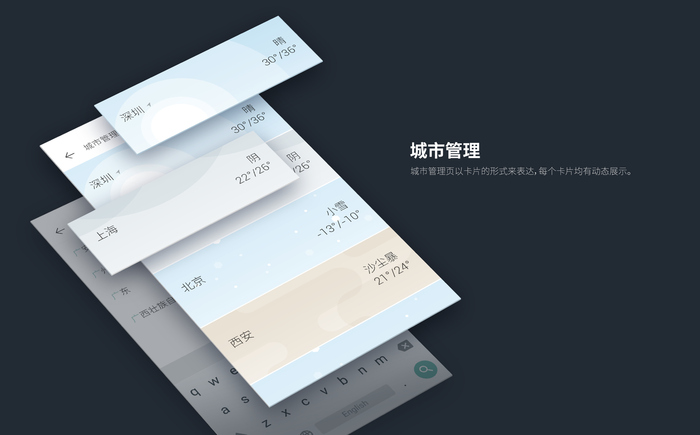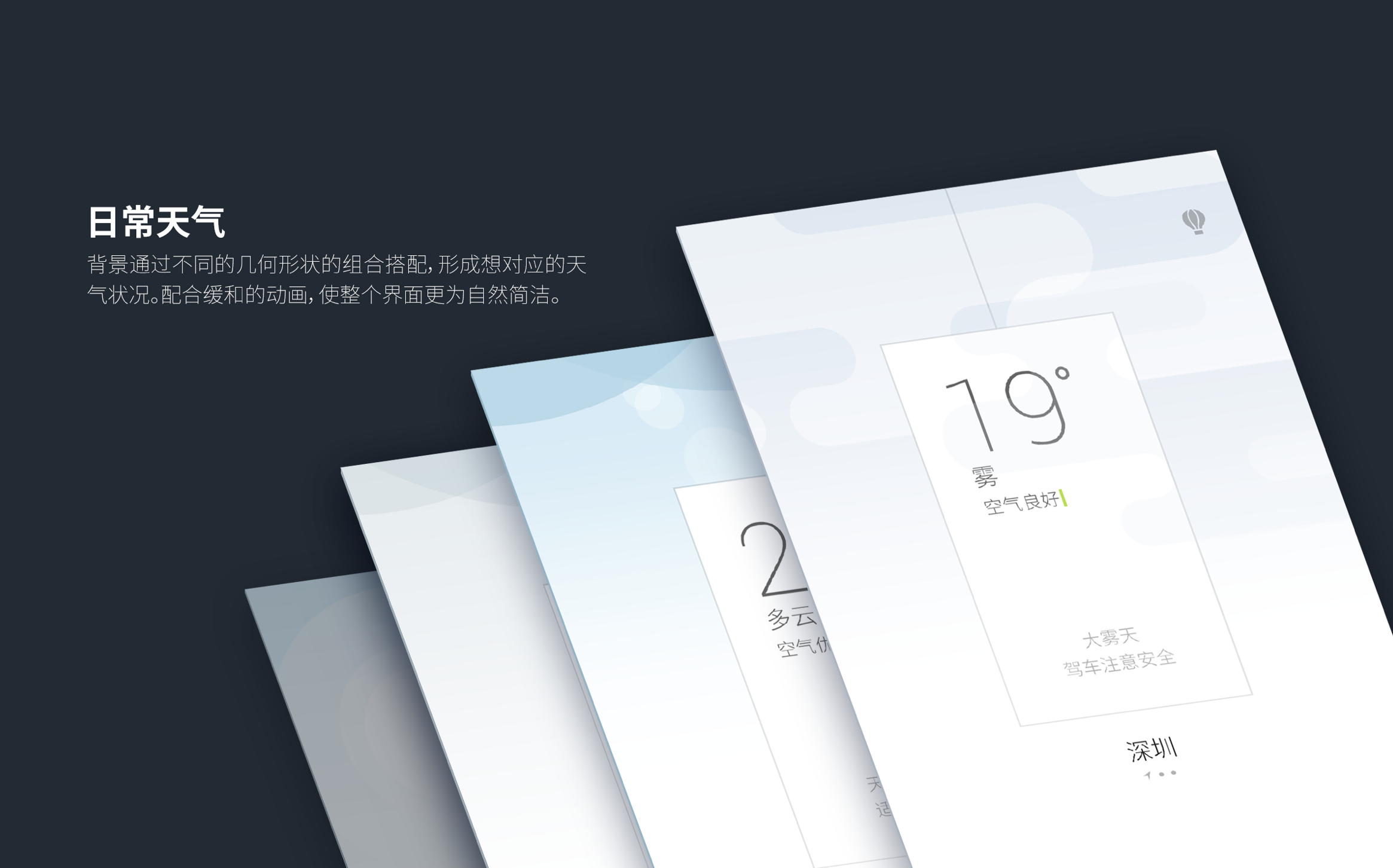 通过小卡片与背景天气的关系,构成一个看出窗外的场景,卡片具有互动性,显得有趣,贴近生活。