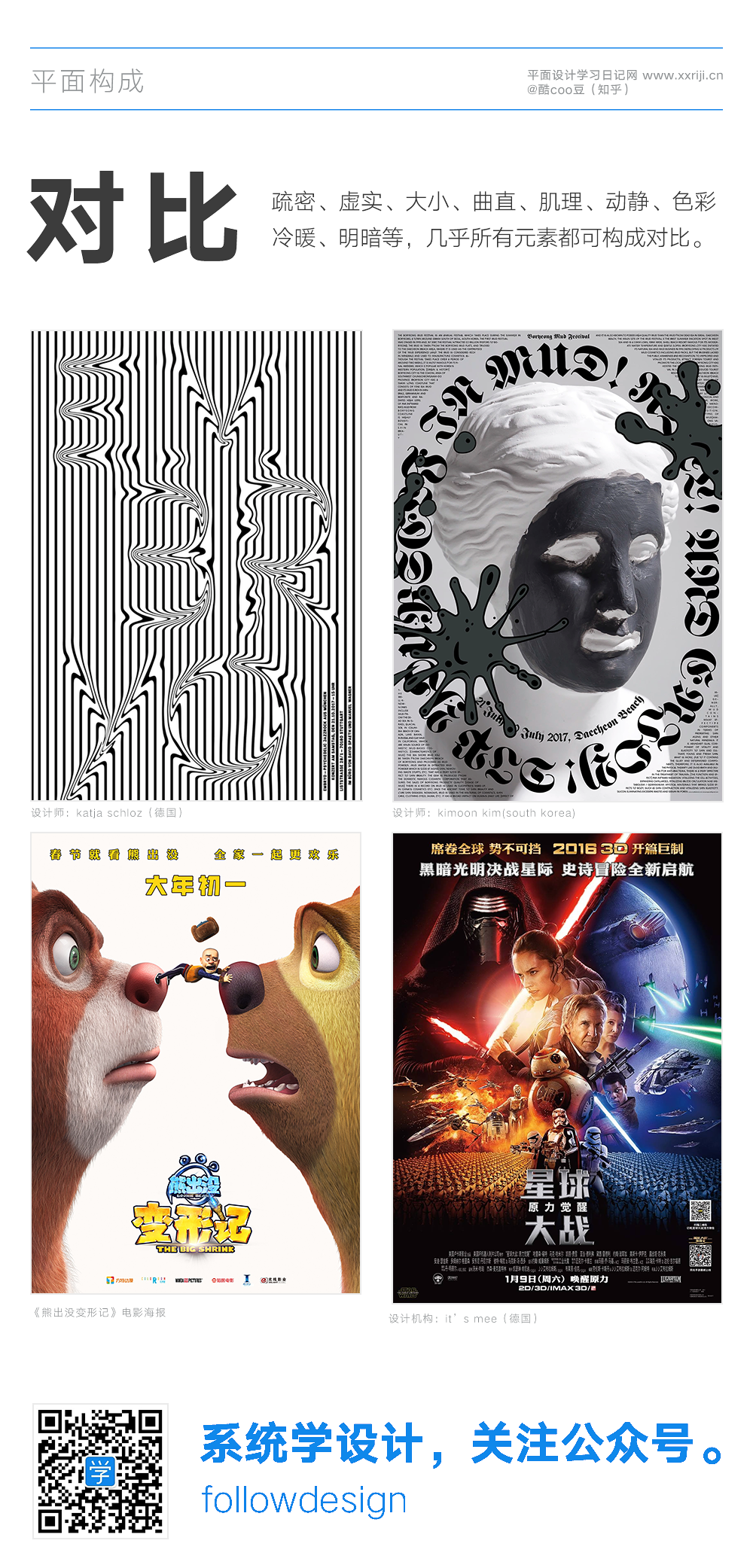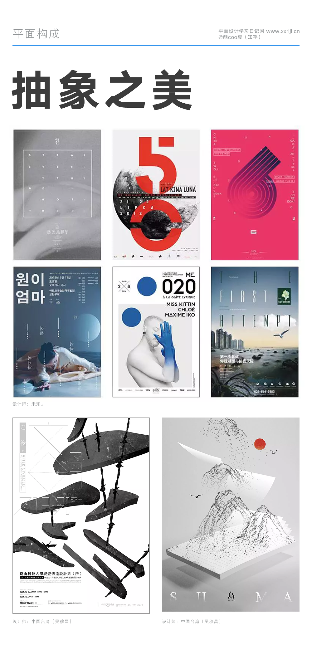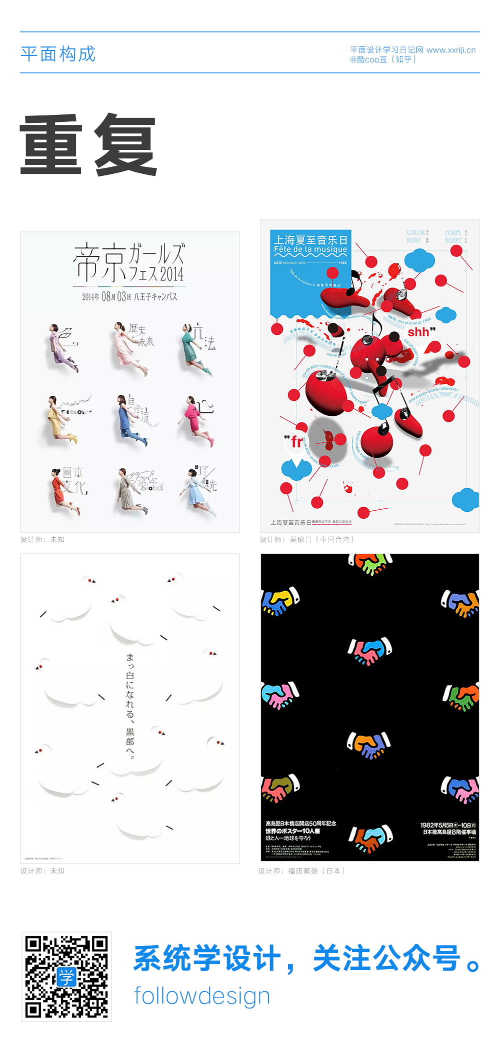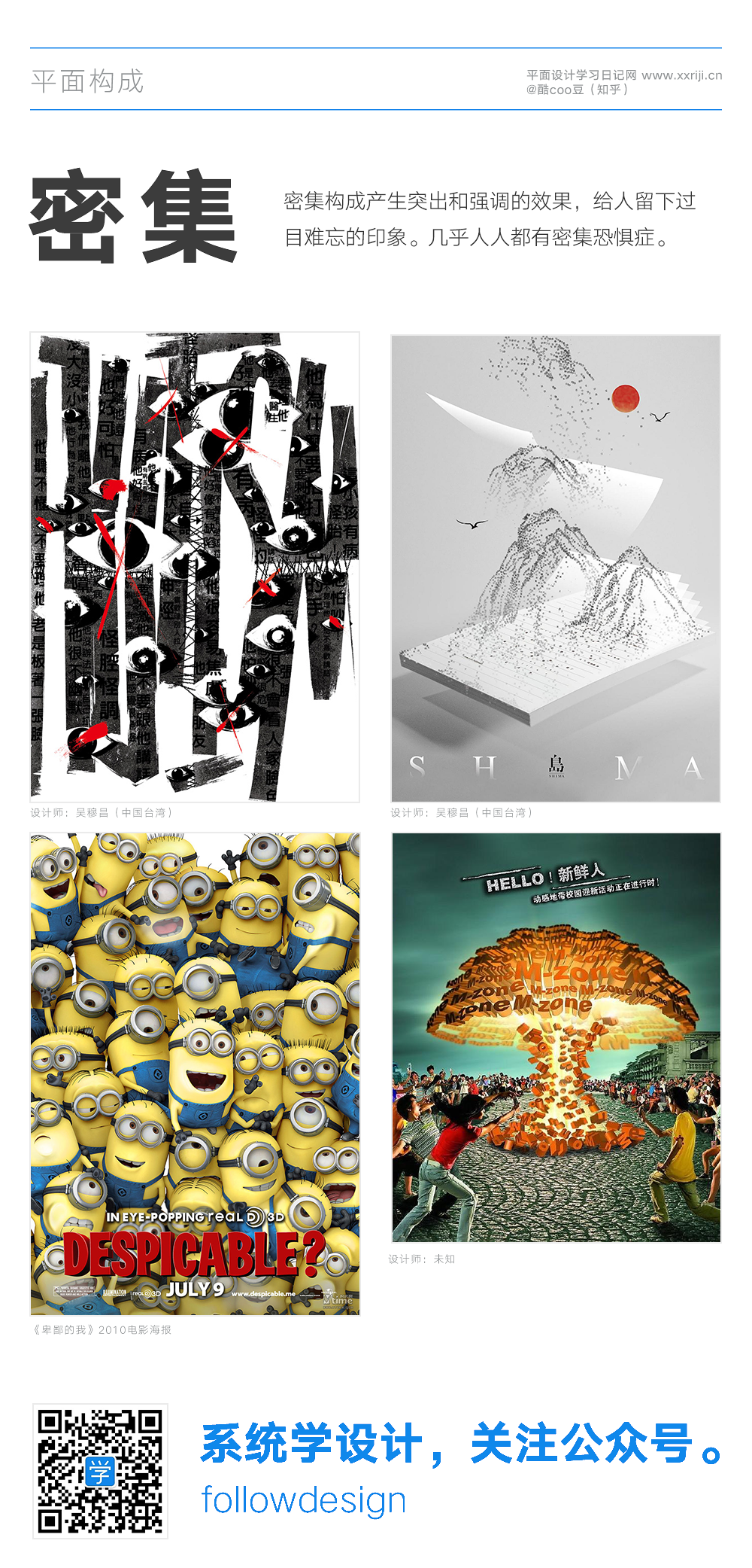 OK,以上就是@酷coo豆 整理的《平面设计中常见的平面构成形式》的全部内容。更多设计教程、书籍、经验分享,欢迎关注「平面设计学习日记-专栏」,或访问平面设计学习日记网。