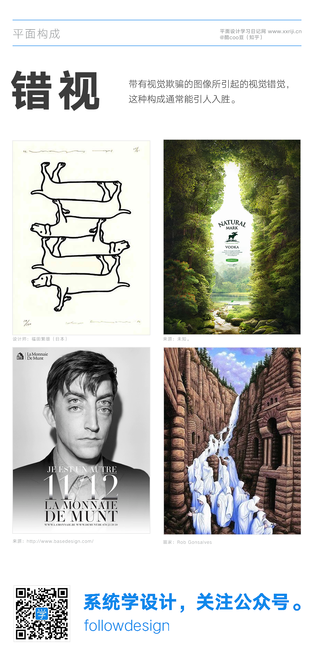 而常见的平面构成形式有:重复、正负形、特异、密集、渐变与发散、对比、分割、近似、肌理、错视与矛盾空间等等。这些构成规律,亦是我们平面设计设创作的灵感源泉。
