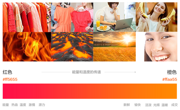 色彩体系上我们选用了大胆新颖的渐变色作为产品色,从红色到橙色的渐变,代表能量到温度的一种传递。以橙色作为基础延续色,让用户保持有淘宝场景的延续认知。在渐变传递概念的基础上,制定了各个不同垂直行业的渐变色规范。