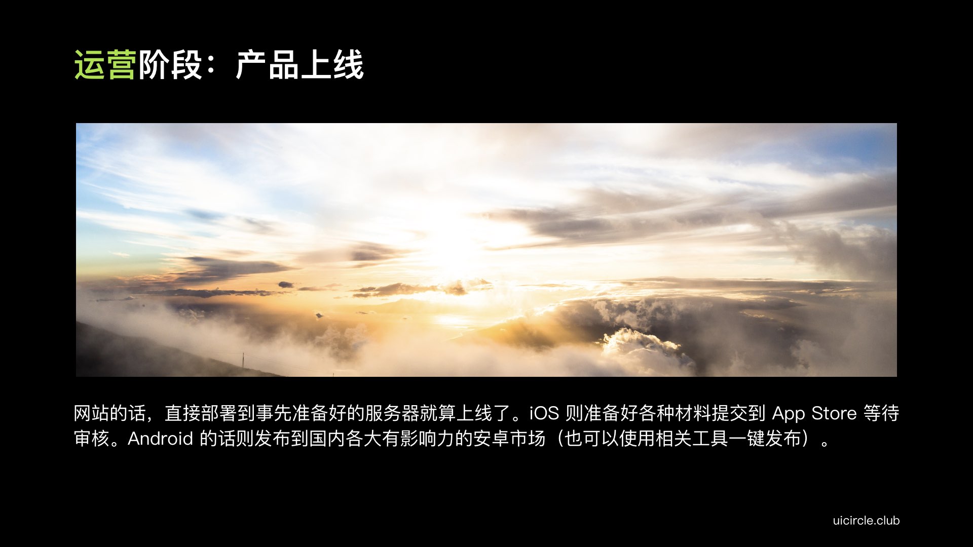 网站的话,部署到事先准备好的服务器就算上线了。iOS 则准备好各种材料提交到 App Store 等待审核。Android 的话则发布到国内各大有影响力的安卓市场(也可以使用相关工具一键发布)。
