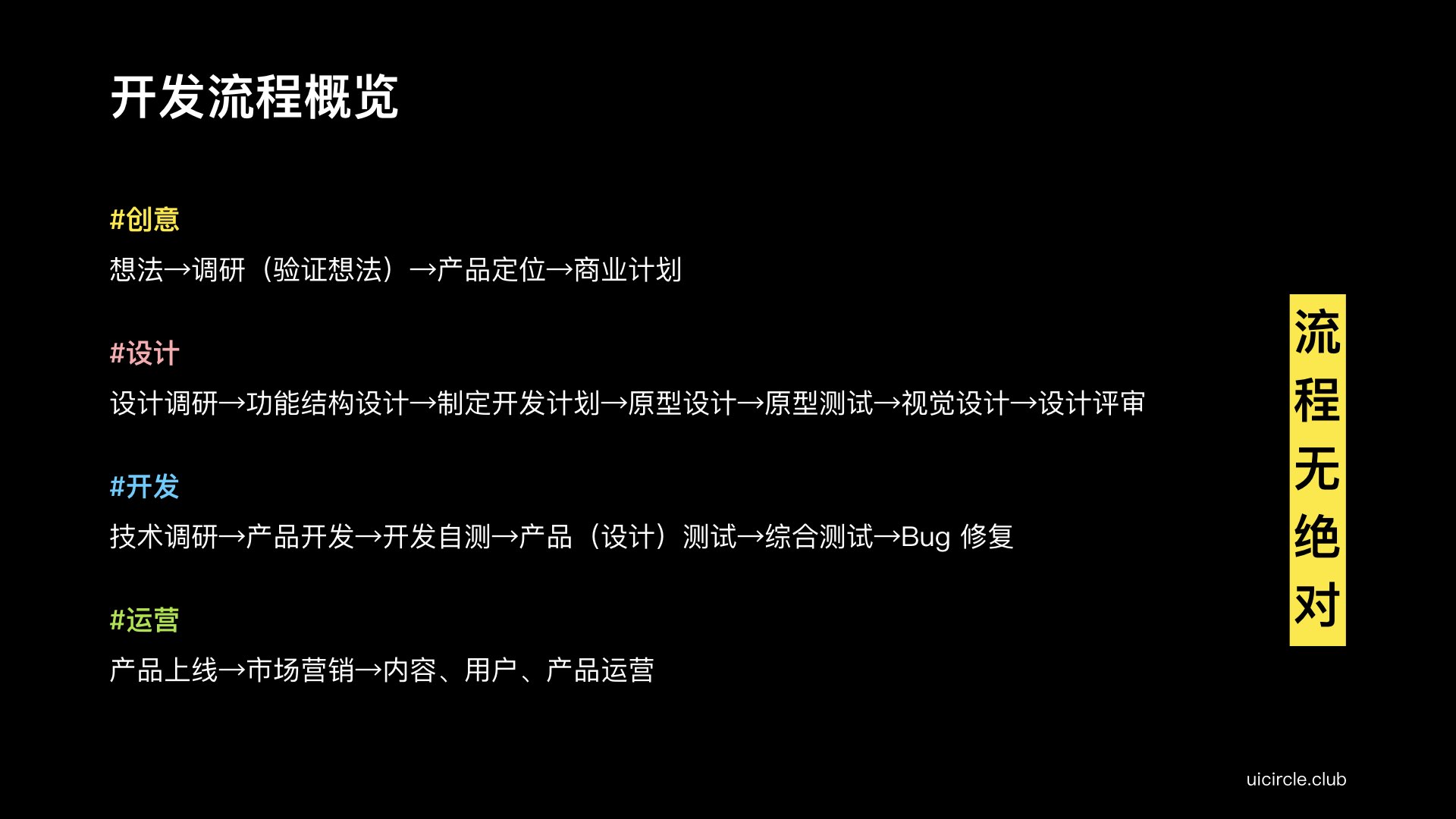 特别提醒,图示流程并非线性的,尤其敏捷开发时很多步骤都会重合同时进行。而根据情况,某些步骤也会打乱亦或穿插在流程中,比如调研工作就是贯穿始终的。但就产品开发流程而言,重点无非就是这些。