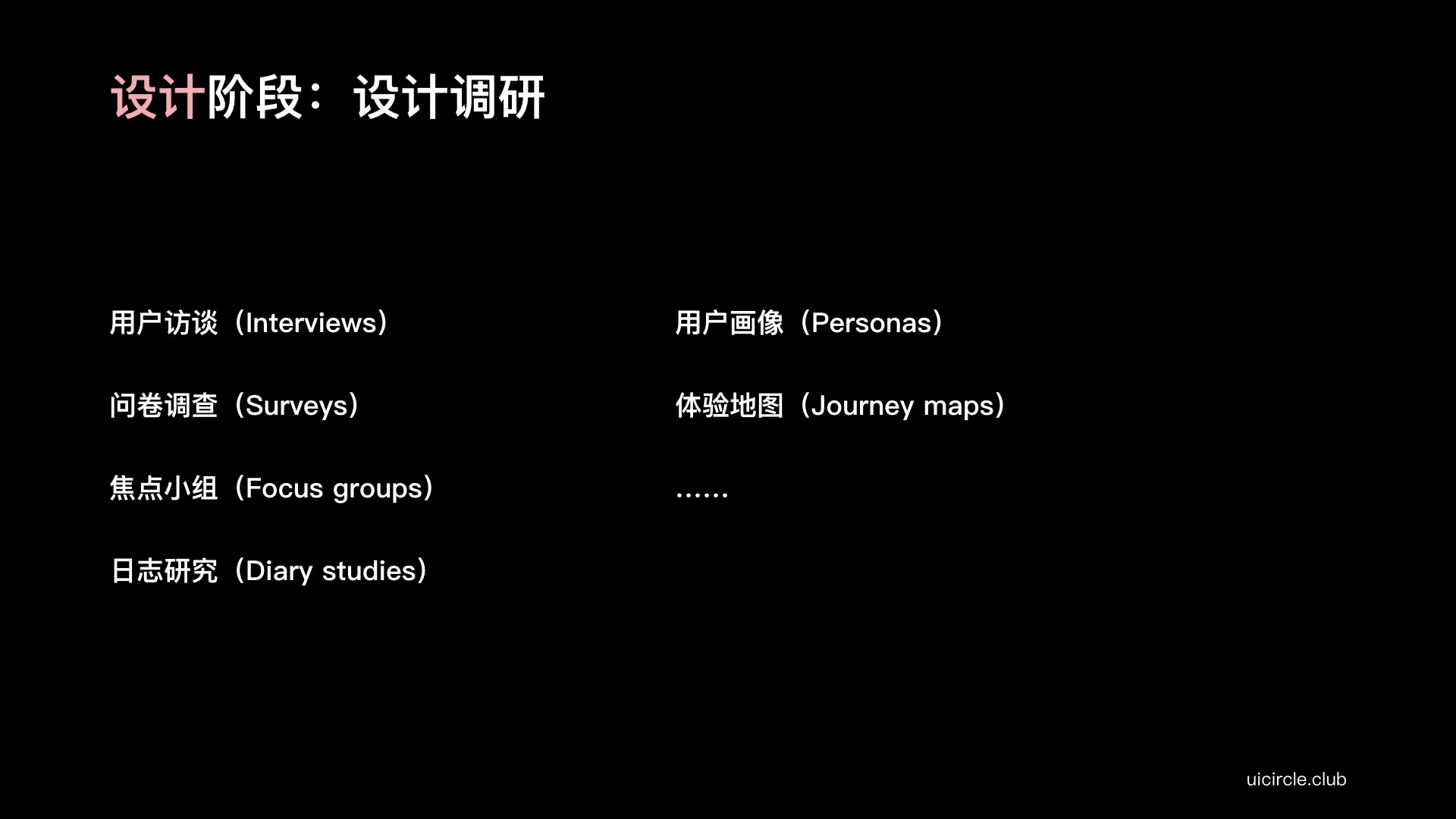 设计调研部分主要是通过各种研究,更进一步地清晰和明确产品定位的内容,为后续的设计提供基础。对于人机交互、用户体验设计领域,最常用的有用户访谈(Interviews)、问卷调查(Surveys)、焦点小组(Focus groups)、用户画像(Personas)、体验地图(Journey maps)等等。