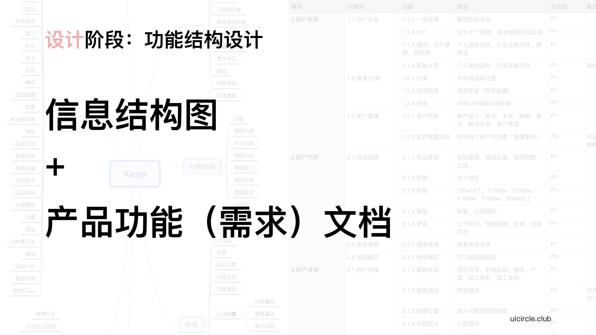 我在这用了「功能结构设计」一词,其实就是包含「产品功能文档」、「信息结构图」等用来梳理产品功能和信息相关的工作。而且不只是用户端,可能也会在这时就对应梳理后台的功能。