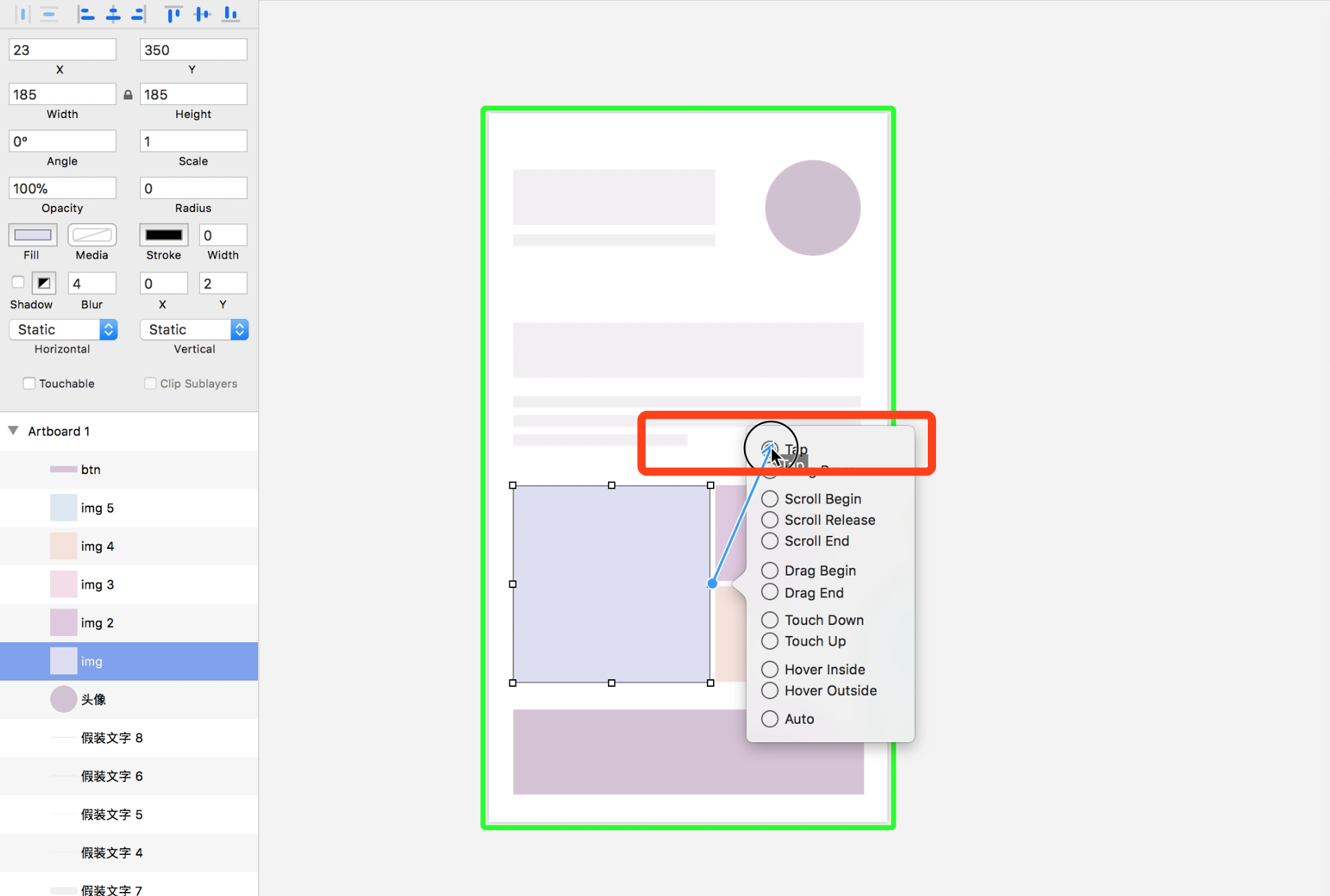 03-选中最大的图片,在右侧发现“闪电”图标,点击图标会出现支持的事件列表: