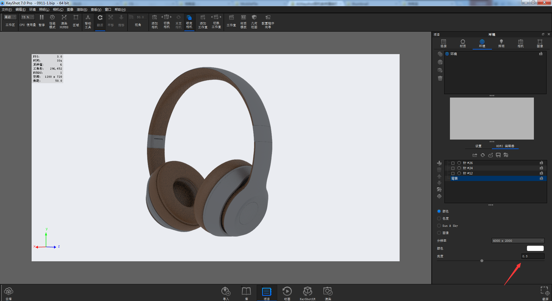 确定好角度以后,我为了保持宁欠勿爆的效果,我将HDR环境中的背景亮度调整为0.5