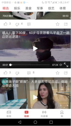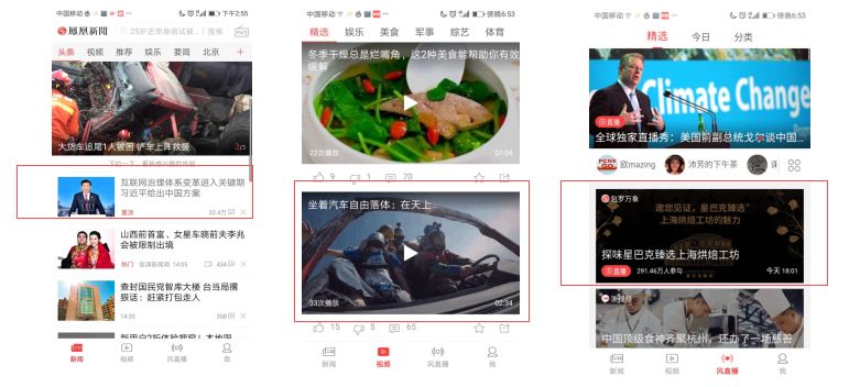 主任务效率:凤凰新闻的主任务是新闻的信息流,小视频和风直播,这些都在首页tab中直接进去,然后就如上图所示的界面。在视频和直播的tab里面都是直接可以点击观看的。层级浅,效率高。