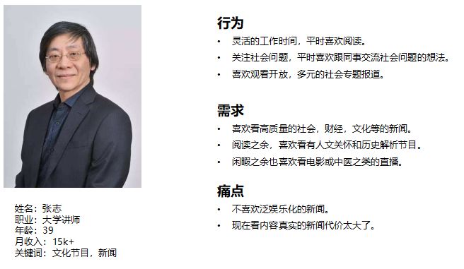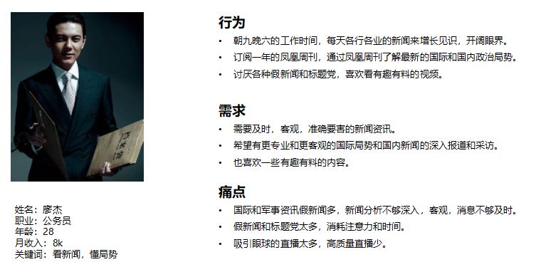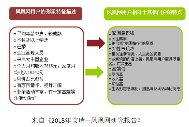 凤凰新闻脱胎于凤凰网凤凰卫视,因此运营内容以国际大事,财经,军事为主要内容,同时也运营多档文化传承,历史解读,社会问题分析等深度的内容,从运营内容可以得出,主要观众是来自大陆的知识分子和高收入的男性精英群体。这部分人也进入了凤凰新闻的主要用户群体当中。