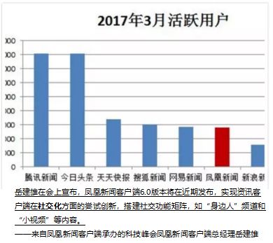 平均日活用户凤凰新闻客户端表现更加强劲,2017年3月达到2068万,比2016年12月增加381万。今年的2月和3月份,凤凰新闻客户端的日活用户已经超过搜狐、网易、新浪,排在第4位,前三位是:腾讯、今日头条。岳建雄在会上宣布,凤凰新闻客户端6.0版本将在近期发布,实现资讯客户端在社交化方面的尝试创新,搭建社交功能矩阵,如“身边人”频道和“小视频”等内容。天快报。——来自公众号“壹观察”《凤凰新闻客户端发力下半场:内容+技术解决个性化阅读之殇》