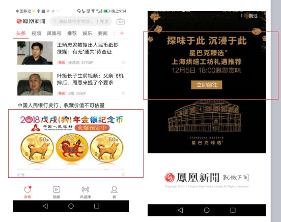 凤凰新闻的广告主要放在首页的信息流中间,这是大多数资讯类app的变现方式,但是首页中广告的条目占据的空间差不多界面的1/2。可能会打扰用户的阅读。