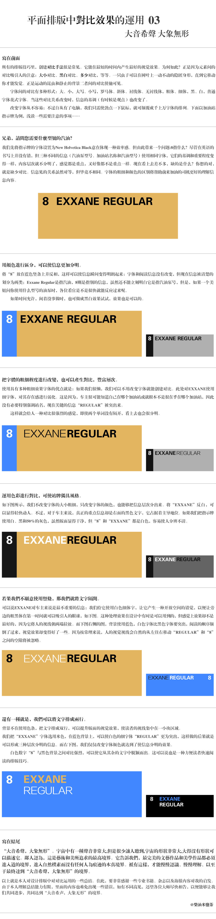 所有的排版技巧里,创建对比手法很是常见。它能在最短的时间内产生最好的视觉效果。为何如此?正是因为元素间的对比吸引人的注意:大小对比、黑白对比、多少对比,等等……
