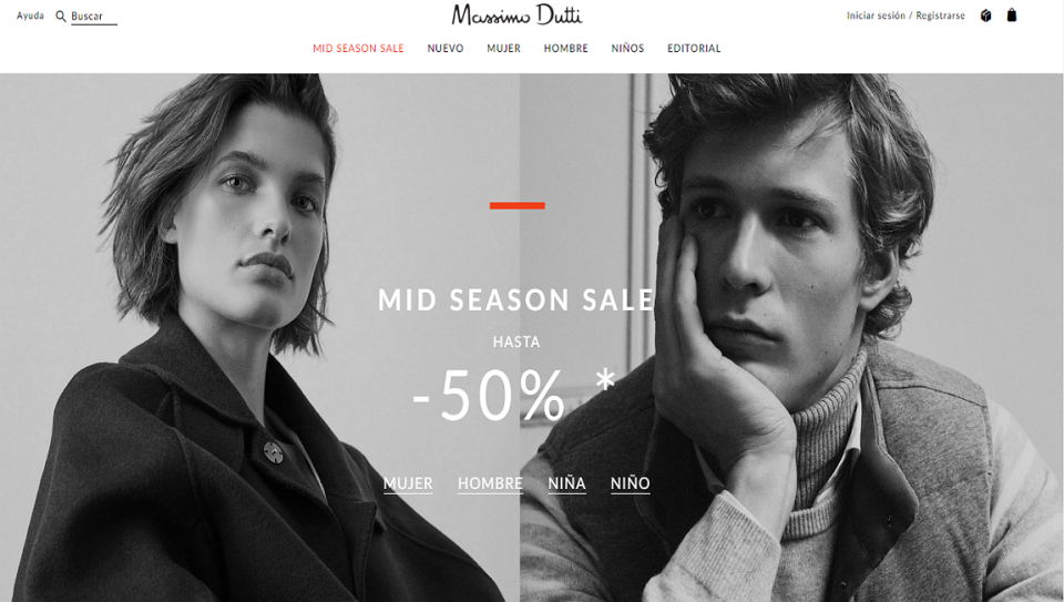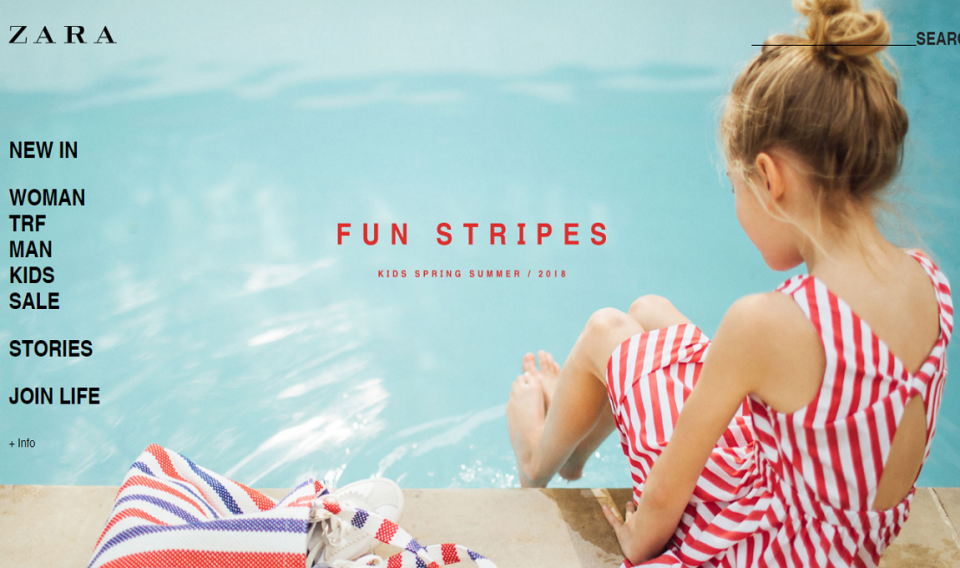 Zara可以说是国内很受欢迎的年轻人品牌,价格亲民。网站的设计简单明了,以加粗的黑色字体来展现文字内容,滚动大图片的形式来突出Zara当下最流行的时装。左边的导航栏排版清晰,可以点击任意文字链接获取你想要了解的信息。
