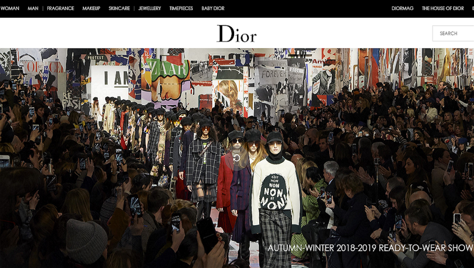不得不说大品牌的网站设计确实很精妙,一张秀场的大图来凸显网站的主题和Dior的实事报道。图片展示虽多,但合理的排版让人一眼就能找到重要信息和菜单项目。使用黑色背景凸显左侧上方的导航菜单字体,让用户一目了然。