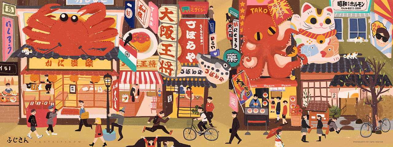 饭太稀Fan:在《谢谢款待》这本书的创作过程中,我的绘画方式发生了改变,也让我在开始创作新内容之前有了更全面的思考。书里我画了一幅比较复杂的街景——道顿崛,那是我之前从未尝试过的形式,从思考、构图、创作再到完成花费了很长的时间,绘画的过程锻炼了我的耐心和观察力,应该算是这本书创作过程中最大的突破。