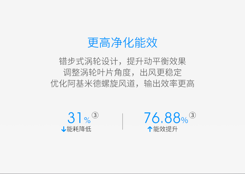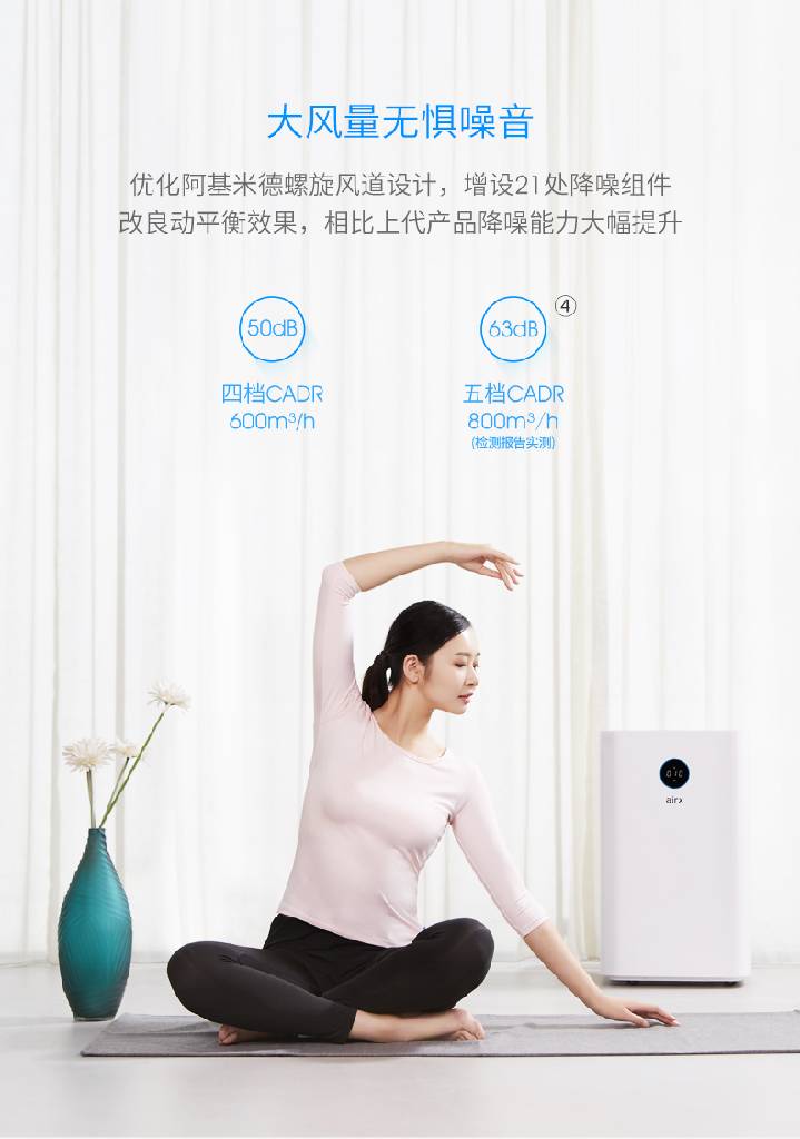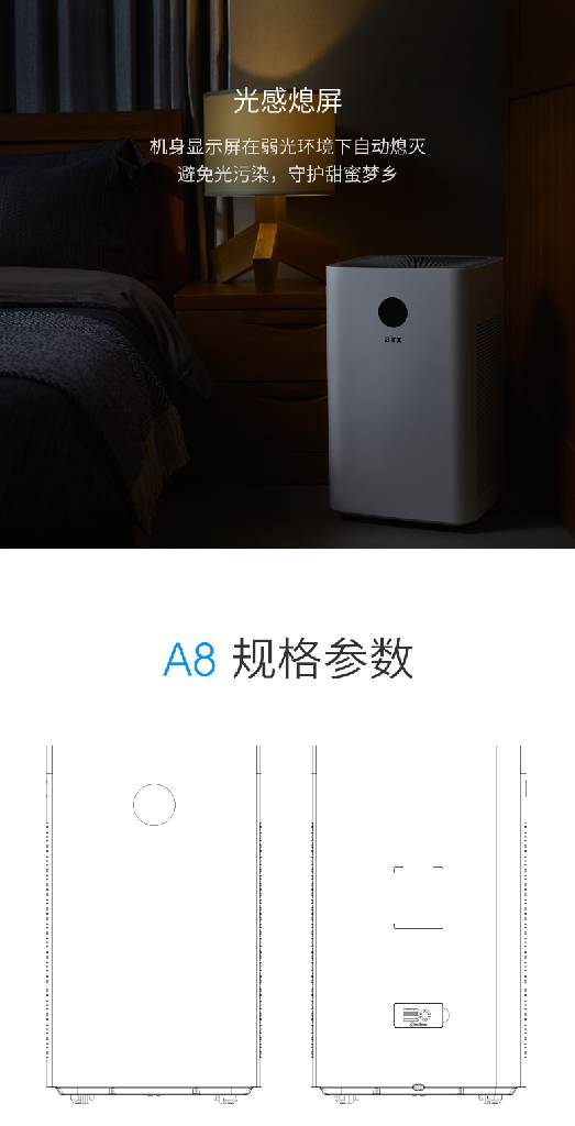 详情页的布局通篇都是为什么我们能做到净化快噪音低的诠释,比如双进风顶出风结构降低风阻;比如双叶轮风机增加风量;超大滤网降低风阻的同时还增加进风量……其中掺杂着对于净化器的总结——净化快,噪音低,滤网使用时间久,外形美观,智能控制