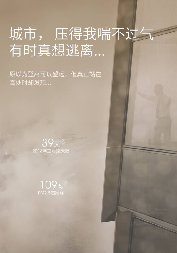 现在加上产品去串联:“一个生活在水泥森林(一线城市)的上班族上有老下有小,压力很大,面对雾霾对家人及自己的伤害自己却很无奈,只能望着雾霾叹息(场景带入制造雾霾的恐慌感)幸亏家里买了空气净化器至少能保证家人的呼吸健康,无论吃饭睡觉,看书、运动、陪孩子玩耍都没有任何顾忌了”