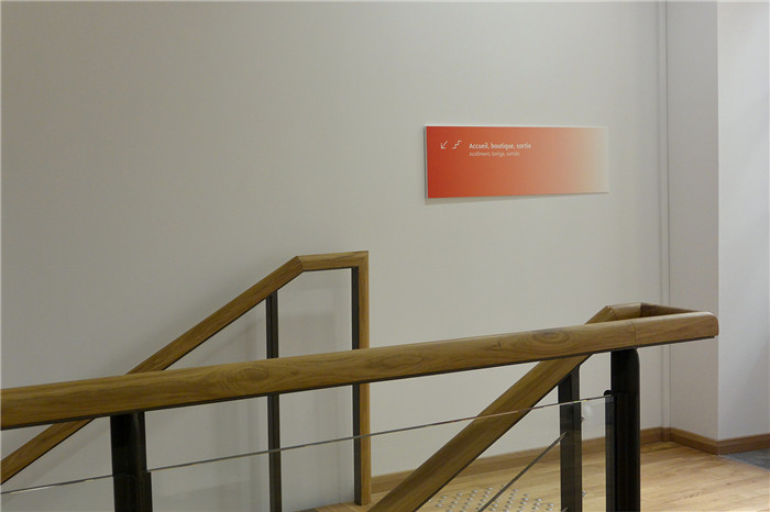 展览空间导视系统采用丝网印刷工艺,干净清晰的文字直接印在墙上成为空间装饰的一部分。由铝制金属版制成的说明牌固定在螺杆上,简洁实用、低成本而且便于安装更换。针对方向引导性的导视牌,色彩上选用橙色与白色组合搭配,兼具功能性与美感。简单的造型设计伴随着颜色的过渡设计斜角梯度,似乎就像从墙上弹出,与建筑很好的融为一体。